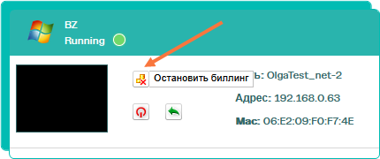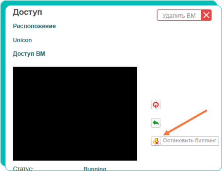 Отключение биллинга – останавливает ВМ с запретом изменений параметров ВМ, запуска восстановления из снапшота, бэкапа, а также закрывает доступ к подключению через консоль.