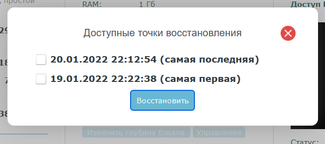 2. В разделе "Управление ВМ" для выбора доступных точек восстановление нажмите на кнопку "Восстановить".
