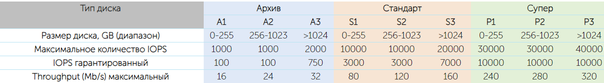 Для подключения доступны три разных типа дисков с повышенной производительностью и гарантированным выделением IOPS.